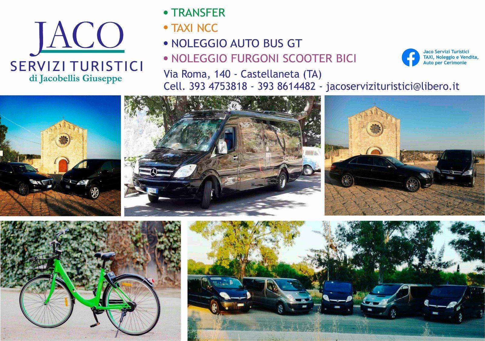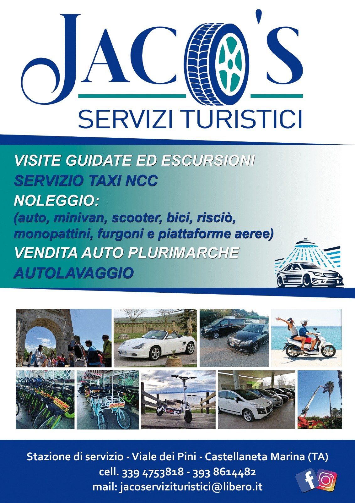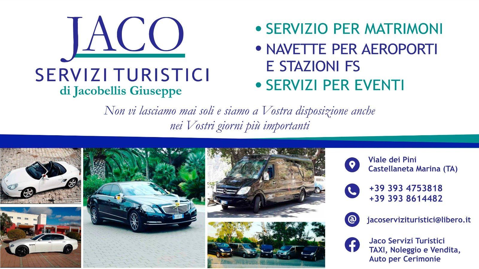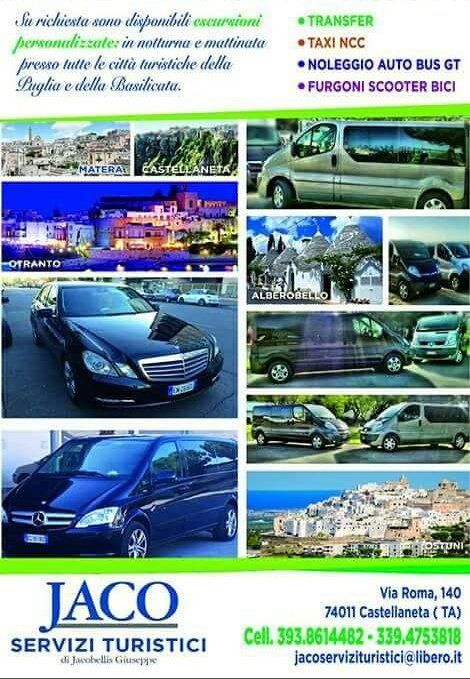 Jaco Servizi Turistici ha sede a Castellaneta in provincia di Taranto. Con il nostro valido supporto puoi raggiungere facilmente tutte le località di vacanza della Puglia e fare ritorno a casa, contando su un team di autisti esperti che riescono a rendere il viaggio assolutamente confortevole. Siamo disponibili anche per servizi di lavoro, per accompagnare i titolari e i dirigenti d'impresa durante i congressi e gli appuntamenti professionali. Disponiamo di automobili delle migliori marche, con optional che rendono gli spostamenti comodi e sicuri. Abbiamo Lancia, Maserati, Jaguar, Porsche e Ferrari, con un parco macchine adatto alle occasioni più esclusive.