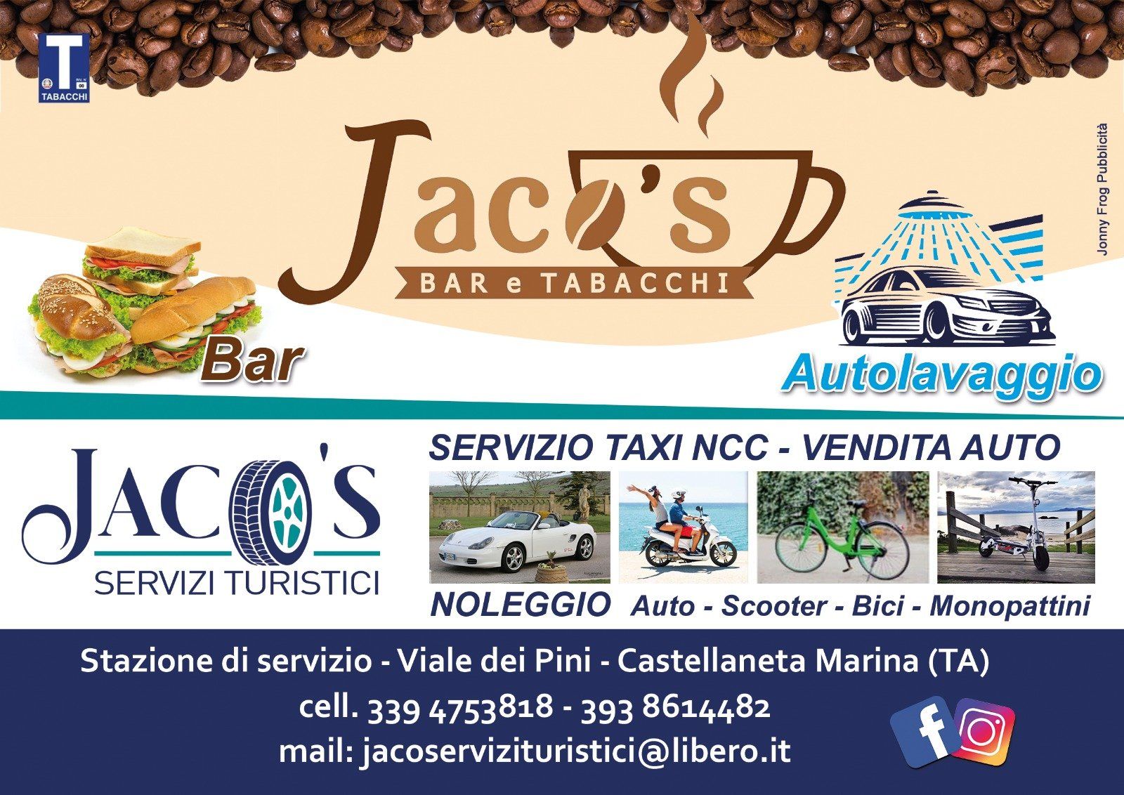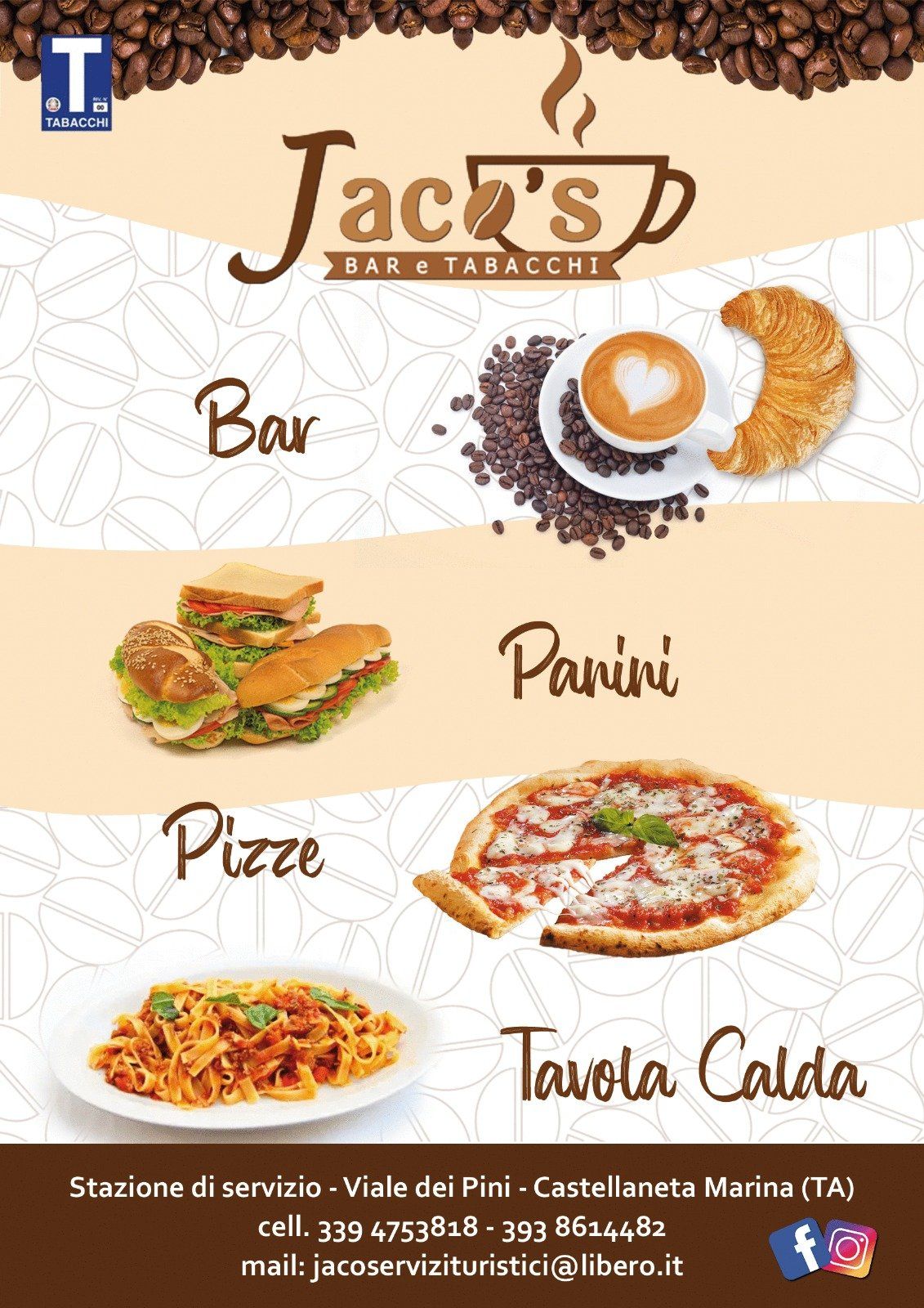 Lo staff di Jaco Servizi Turistici gestisce un angolo ristoro, dove le persone possono fermarsi per una pausa pranzo o per uno spuntino. Jaco's Bar e Tabacchi prepara stuzzichini, merende, caffè e bibite, per consentire a tutti di riprendere le energie e rimettersi in viaggio. Le pietanze che serviamo sono realizzate con ingredienti genuini, rigidamente selezionati tra i più buoni che offre il mercato. Abbiamo la vendita tabacchi, con un vasto assortimento di sigarette per ogni preferenza. La nostra stazione di servizio ti aspetta con la tavola calda, per farti assaporare le squisitezze del giorno, con piatti tipici, primi, secondi e prelibati contorni.
